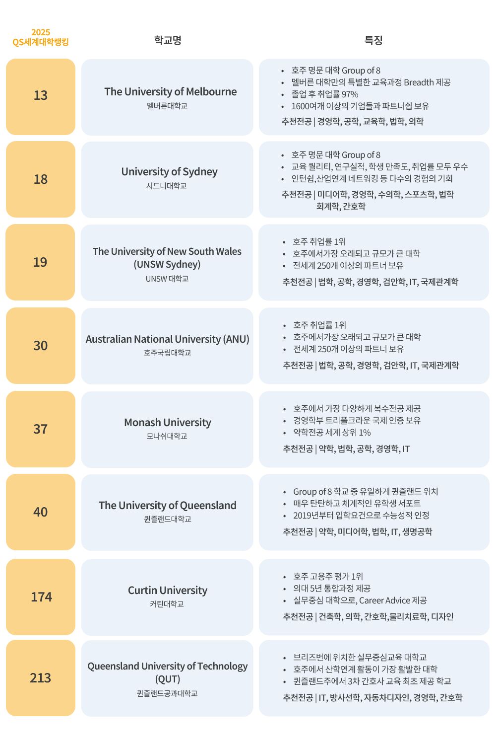 * 호주 명문대 대부분이 현재 수능점수를 받아주고 있어, 수능점수에 따라 호주대학교 1학년으로 진학이 가능