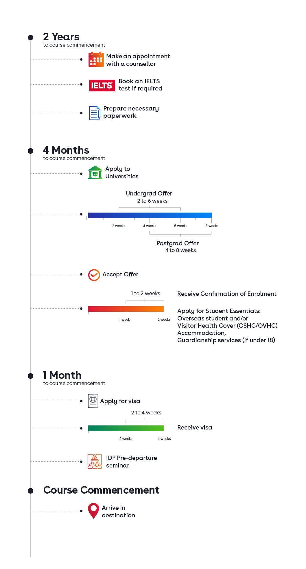 We’ve also created a university application timeline which depicts how early you should apply as well as the documents and actions required.