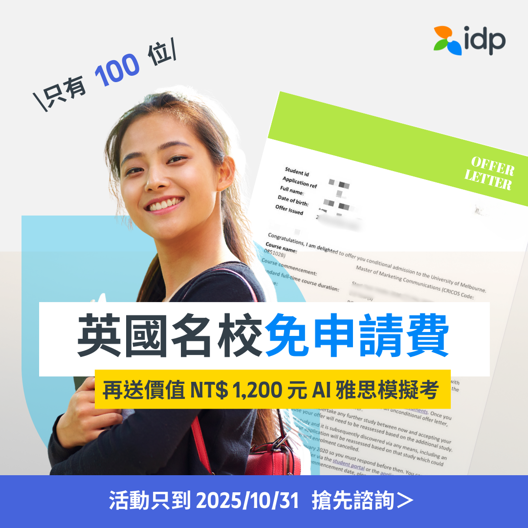 申請英國留學,不需要再擔心代辦費!IDP 與超過 131 所英國大學合作,成為他們在台灣的官方代理機構 (或 官方指定合作夥伴),全程協助學生申請流程,不需任何代辦費。