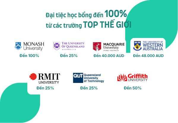 - Săn học bổng giá trị đến 100% từ các trường Go8 và trường TOP 50 thế giới về đào tạo các ngành HOT như Kinh doanh, Kế toán - Tài chính, Khoa học máy tính, Kỹ thuật, Giáo dục, Truyền thông, Công nghệ, Sức khỏe, Nhà hàng - khách sạn, Quản trị sự kiện...